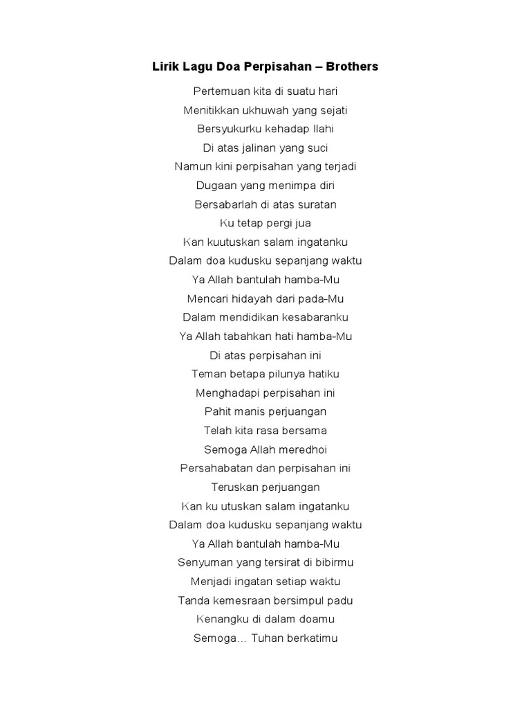 Engkau tempuh segala dugaan mendatang. Untuk mengetahui lirik lagu Selamat Tinggal Guru dan Kawanku simak selengkapnya di bawah ini. Lirik Lagu Doa Perpisahan Brothers.